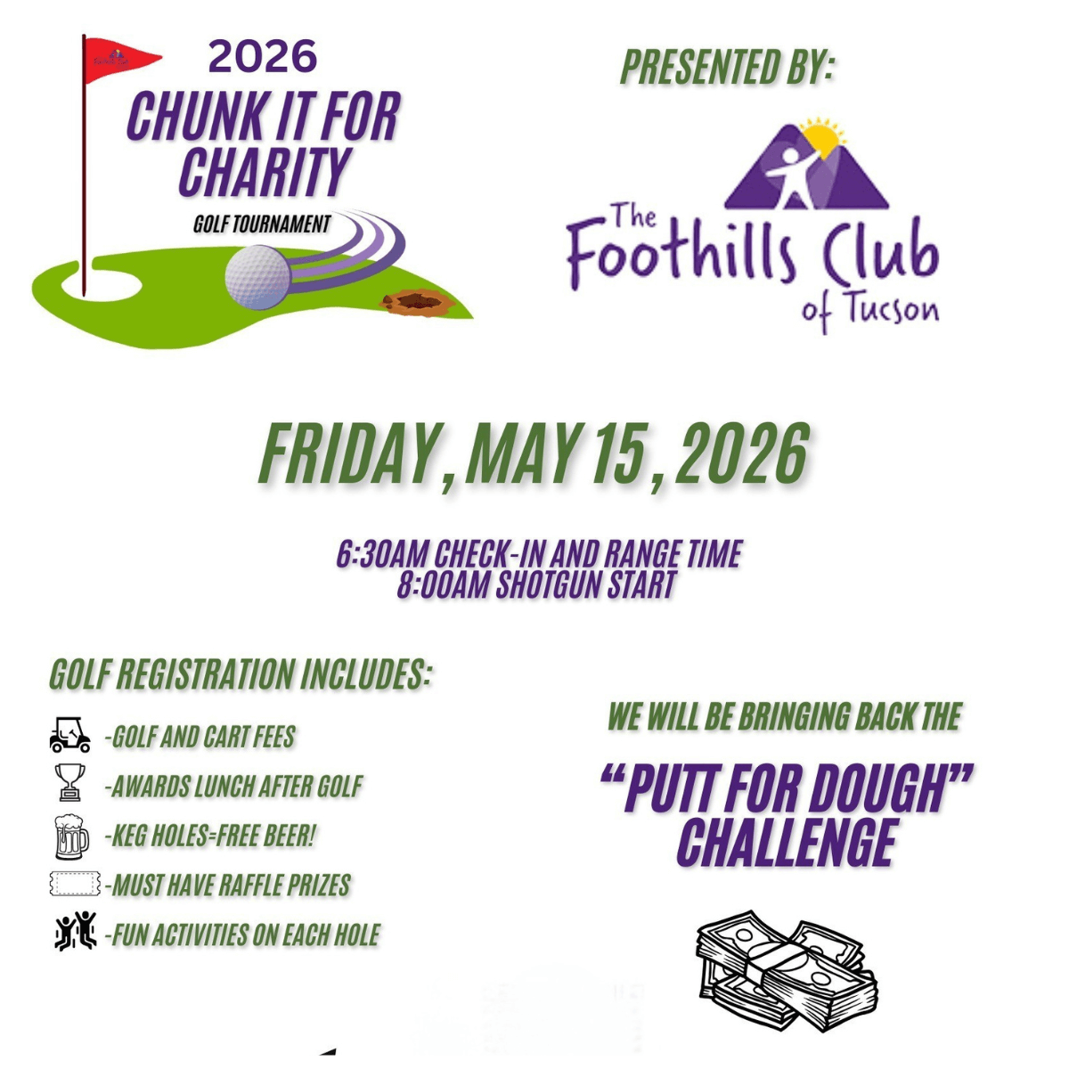 GET READY for our 2026 CHUNK IT FOR CHARITY Foothills Club Golf Tournament on Friday, May 15th, 2026 at Forty Niner Country Club. We have a great tournament planned for you with all the things that make this event stand out from the others.