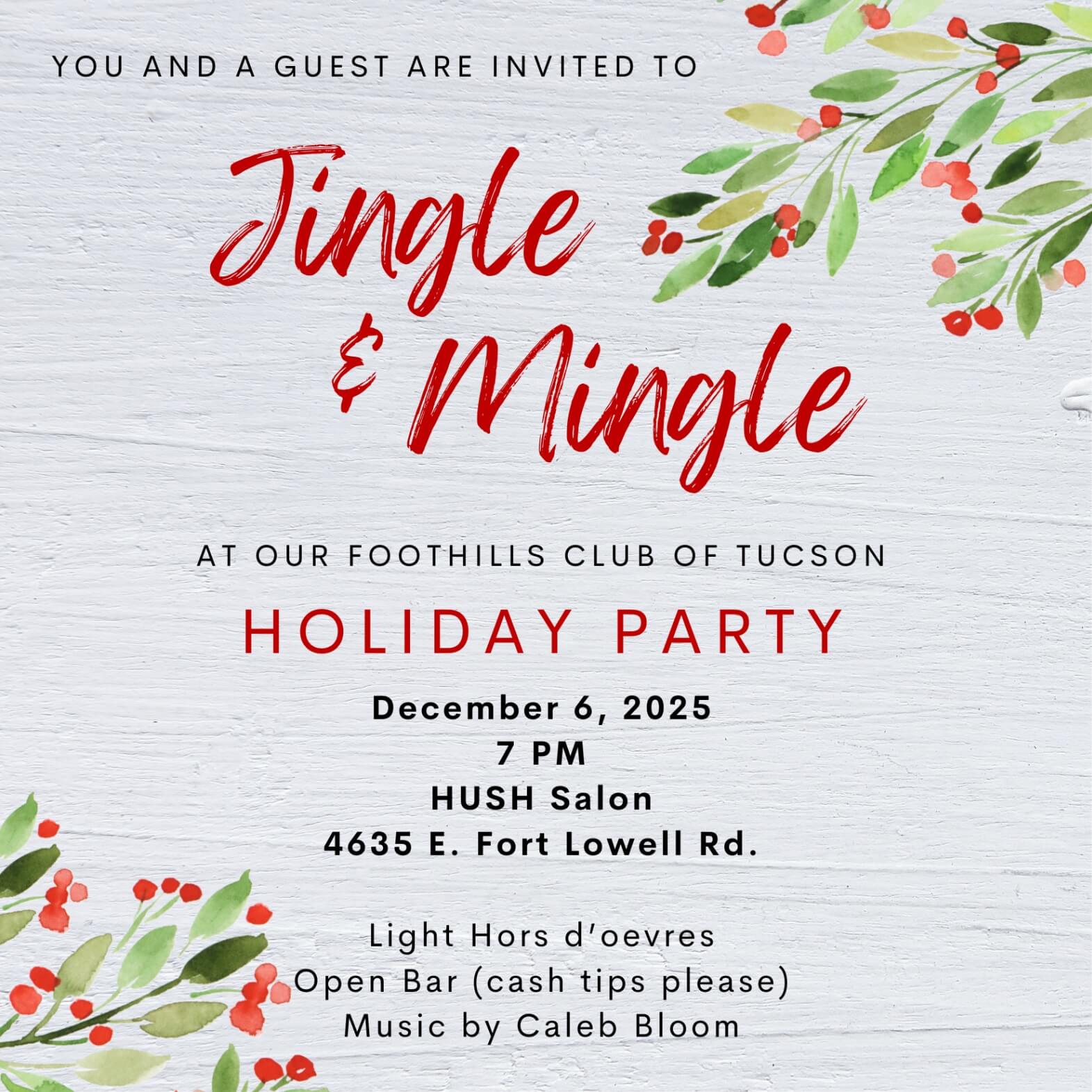 Celebrate the season with the Foothills Club of Tucson at our festive Holiday Party on Friday, December 6th at 7:00 PM at Hush Salon. This special evening is open to members plus one, and we can’t wait to toast to another wonderful year together.